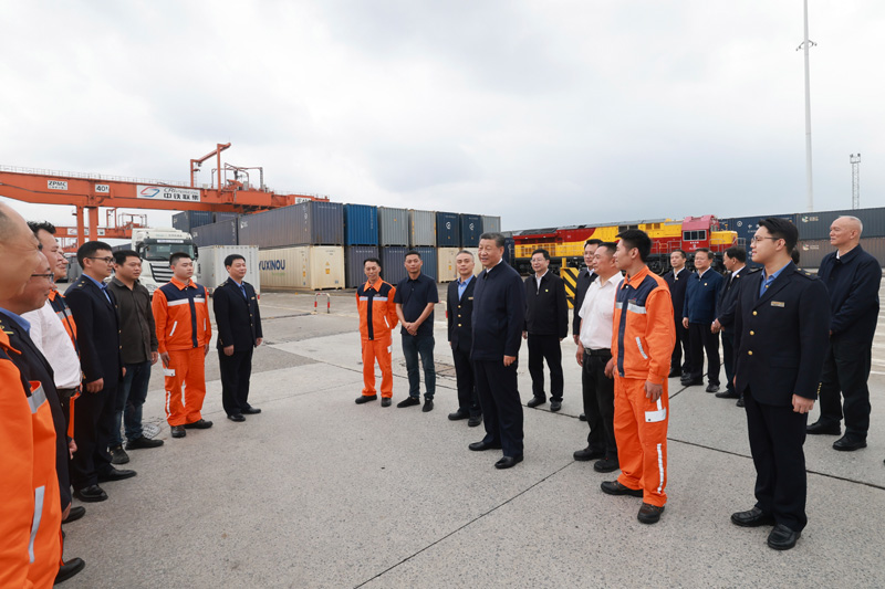4月22日至24日,中共中央總書記、國家主席、中央軍委主席習(xí)近平在重慶考察。這是22日下午,習(xí)近平在重慶國際物流樞紐園區(qū)重慶鐵路集裝箱中心站,同貨車司機(jī)、列車司機(jī)、裝卸工人、場站管理人員等親切交流。新華社記者 王曄 攝