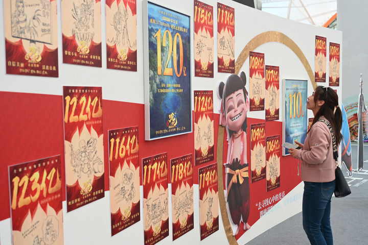 2025年4月19日,觀眾在電影《哪吒之魔童鬧?!肥掷L海報(bào)展上參觀。新華社記者 李鑫 攝