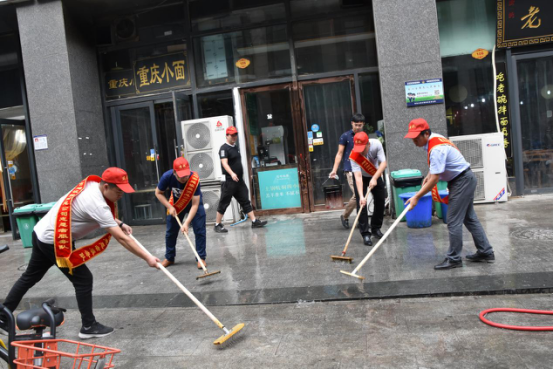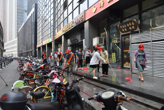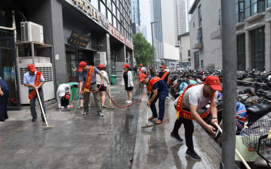二、“全城清潔”行動。清潔家園,黨員志愿者義不容辭。日前,市建投聯(lián)合商務社區(qū)積極響應“全城清潔”行動號召,定期組織志愿者對社區(qū)單位公共區(qū)域、沿街商戶門店等內外環(huán)境進行集中整治。7月14日下午,市建投黨員志愿者分赴中國人保大廈對沿街商戶門店和街道進行集中清理。大清掃活動采取包干打掃、分頭行動的方式,集中對沿街商鋪門店垃圾桶(池)、地面污漬等進行清洗,全面清理整治各類衛(wèi)生死角,清理積存垃圾,杜絕垃圾亂堆亂放。烈日炎炎,市建投黨員志愿者們絲毫不懼37度的高溫,頭戴小紅帽,戴著紅袖標,以高度的敬業(yè)態(tài)度和為人民服務的無比熱情,全身心投入到環(huán)境衛(wèi)生清理中,通過2個小時的辛苦勞動,使人保大廈沿街門店商鋪和街道面貌煥然一新。