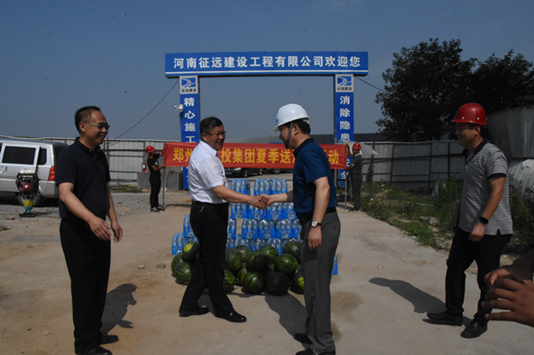 盛夏時(shí)節(jié),高溫炎熱。6月22日上午,由集團(tuán)公司黨委和工會主辦,市政工程建設(shè)管理中心、綜合部、黨群部承辦的“送清涼、保健康、促和諧”慰問活動,走進(jìn)市政工程建設(shè)施工現(xiàn)場,為烈日下辛勤工作的一線工人兄弟送去西瓜、水等防暑降溫物資,送上集團(tuán)公司的親切關(guān)懷和問候。